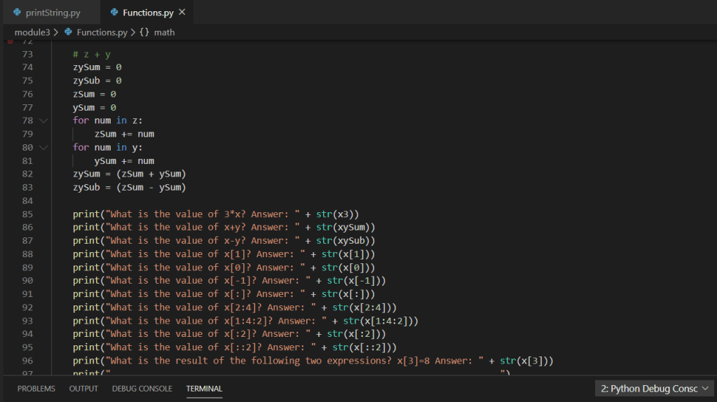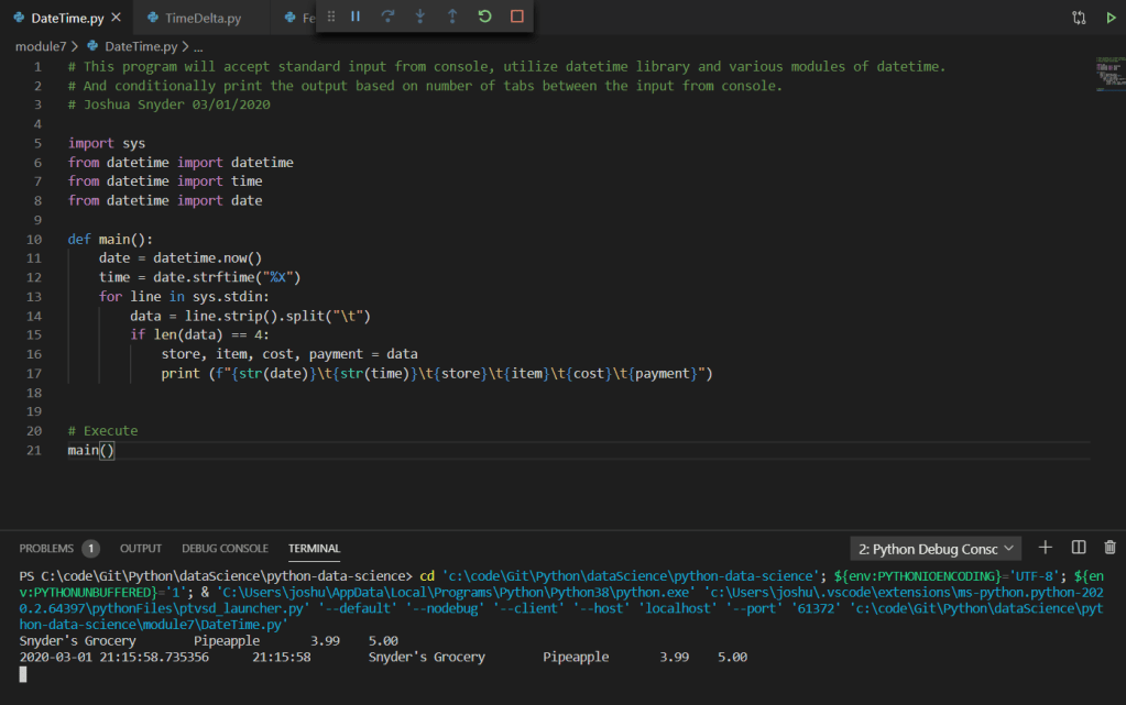 Based on the above screen shot, we can see various analysis output data points from the imported .csv via dataframe. Stepping into a single function for further review, we can see the use of various iterators (for loops), conditional statements (if statements), as well as the additional use of the Pandas extension method for checking NaN on the value of the variable within the iterators. Additionally, we can see the simple arithmetic to compute the total count as well as various percentages.